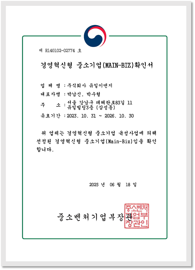경영혁신형 중소기업(Main-Biz) 확인서 |